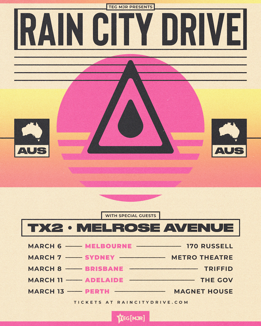 Rain City Drive will be joined on all dates by viral alternative act TX2, as well as rising Sydney metalcore band Melrose Avenue. Kicking off at Melbourne’s 170 Russell on Friday 6th March, the tour continues at Sydney’s Metro Theatre on Saturday 7th March and Brisbane’s Triffid on Sunday 8th March, before the final leg at The Gov in Adelaide on Wednesday 11th March and Perth’s Magnet House on Friday 13th March. Tickets are on sale next Wednesday 12th November at 12.00pm local time via www.teglive.com.au
