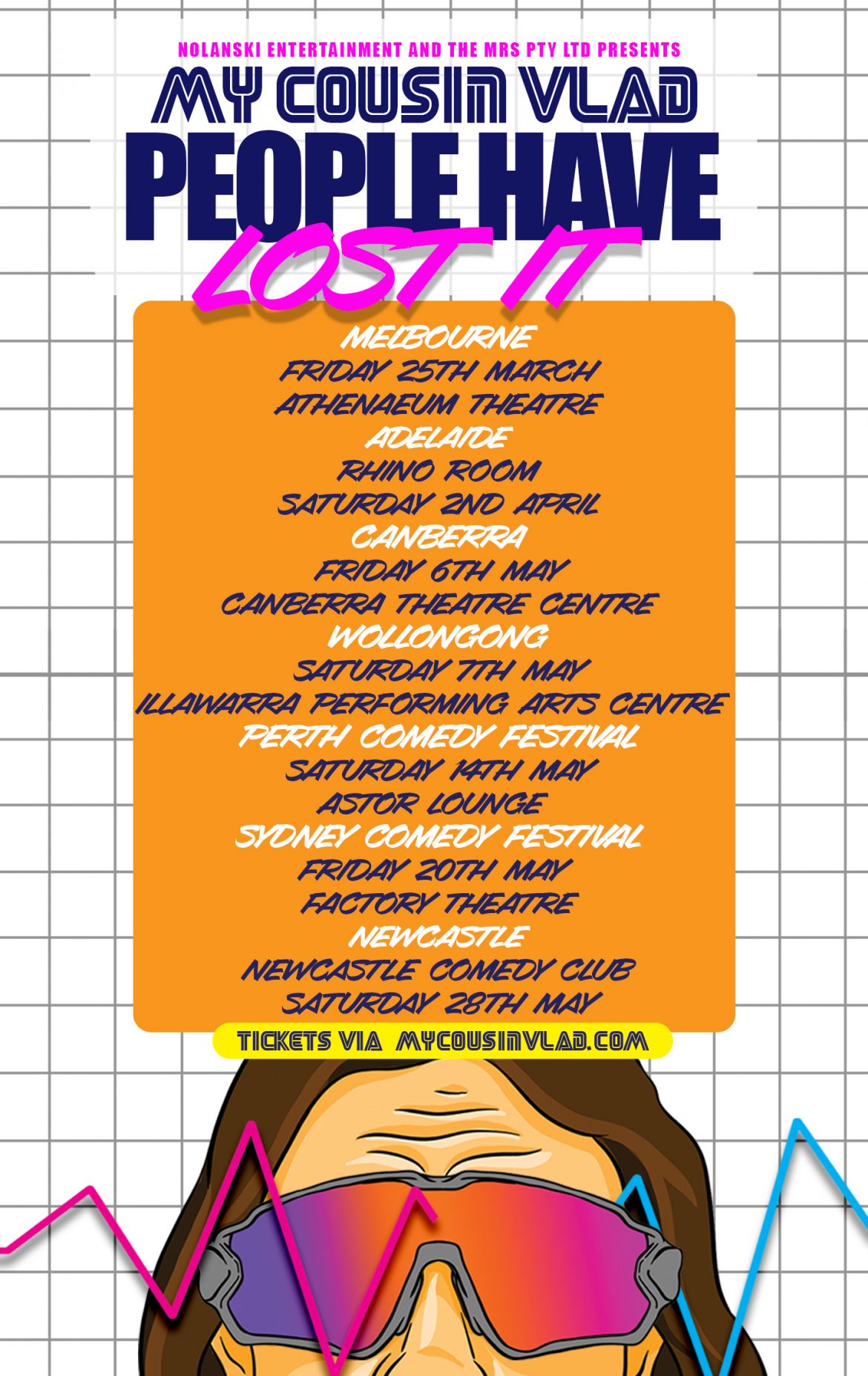 The ‘People Have Lost It’ tour will feature live music, a screen show, and an hour of unpredictable rants and punchlines – My Cousin Vlad hits the core topics of Modern Society, Technology, Wogs (Euros) Vs Aussies, Family and Marriage. His perspective on the most relatable of genres is unique, evocative, and ridiculous. Expect to come in catastropha and leave immaculate.
