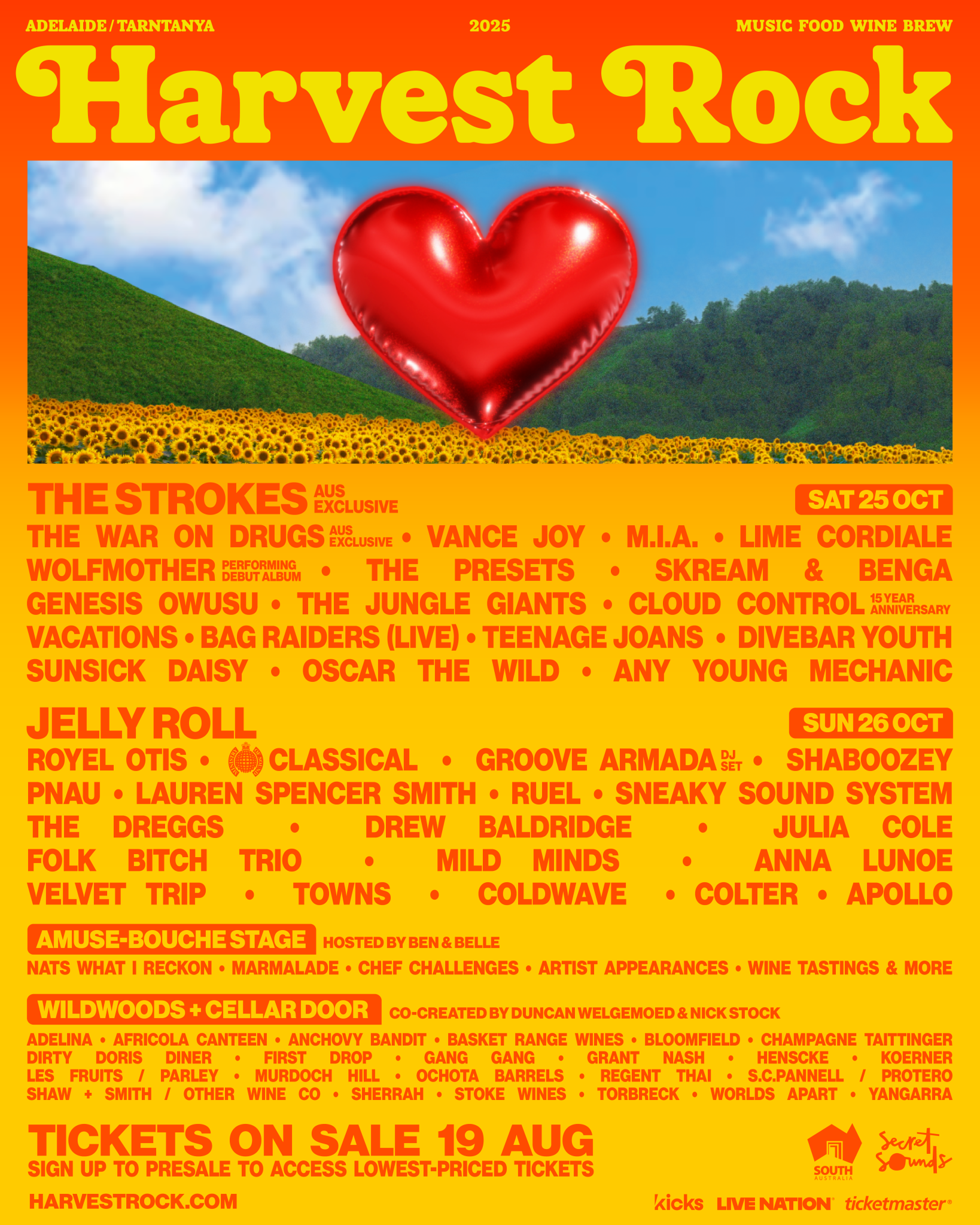 Thursday 14 August – Today, Adelaide’s weekend feast of taste and sound Harvest Rock reveals its stacked 2025 lineup, featuring Jelly Roll, The Strokes (Aus Exclusive), The War on Drugs (Aus Exclusive), M.I.A., Vance Joy, Royel Otis, Wolfmother, Ministry of Sound Classical, Groove Armada (DJ Set), Cloud Control and many more. Promoted by Secret Sounds, alongside presenting partners Kicks Entertainment and Live Nation, this standout cultural and culinary experience of music, food and drinks is returning in its third year to Adelaide’s Rymill & King Rodney Parks / Murlawirrapurka & Ityamai-Itpina on Saturday 25 and Sunday 26 October.