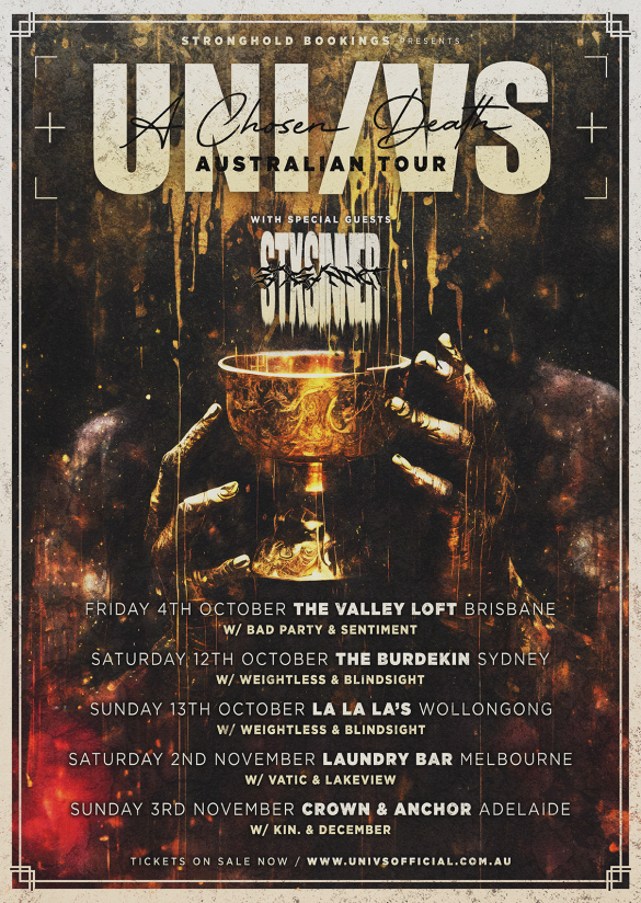 Brisbane metalcore outfit UNI/VS has returned with their latest single, A Chosen Death, alongside the announcement of their A Chosen Death Australian Tour, which will run across the East Coast in October and November. Tickets are on sale now!