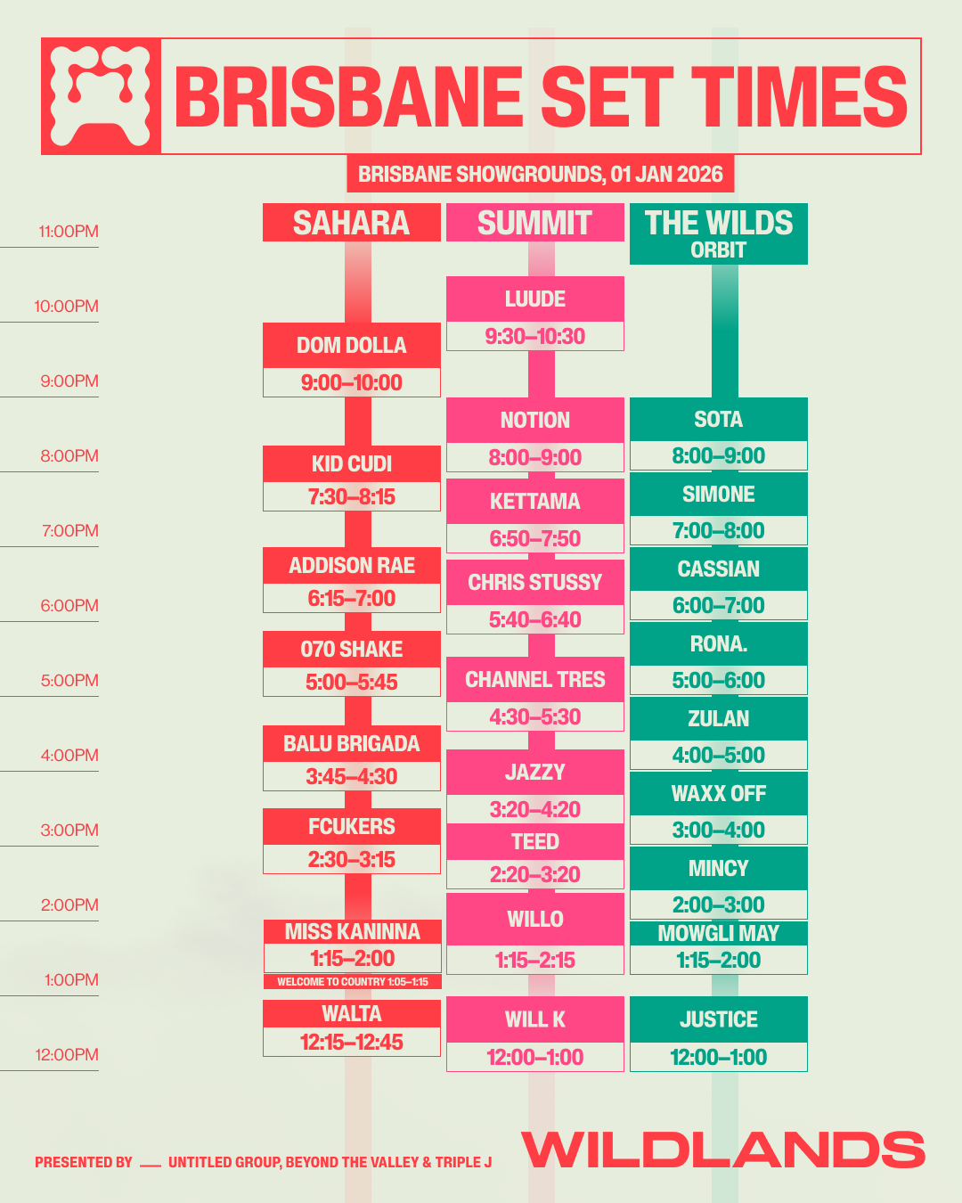 New Year’s Day in Brisbane will see Dom Dolla close out the Sahara Main Stage following a huge run of performances from WALTA, Miss Kaninna, Fcukers, Balu Brigada, 070 Shake, Addison Rae, and Kid Cudi. Over on the Summit Stage, fans can expect peak-time sets from Jazzy, Channel Tres, Chris Stussy, KETTAMA, and NOTION, with a closing set from Luude, while The Wilds stage hosts a stacked program featuring RONA., Cassian, sim0ne, SOTA, and many more throughout the day.