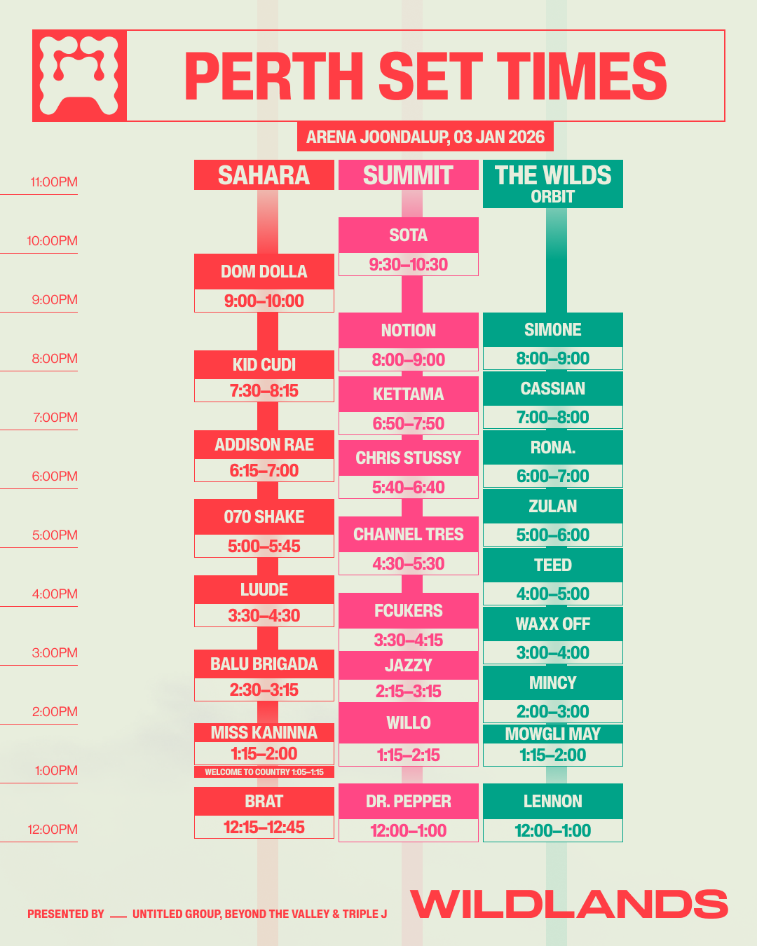 In Perth, Dom Dolla will once again close out the Sahara Main Stage, with BRAT and Miss Kaninna kicking things off before Balu Brigada, Luude, 070 Shake, Addison Rae, and Kid Cudi lead into the evening. The Summit Stage will showcase heavy-hitters including Willo, Jazzy, Fcukers, Channel Tres, Chris Stussy, KETTAMA, NOTION, and SOTA, while The Wilds stage brings energy from Mincy, WAXX OFF, TEED, ZULAN, RONA., Cassian, with sim0ne set to take the closing slot.
